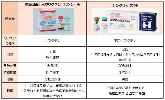 ①生ワクチン(ビケン)と、②組換えワクチン(シングリックス)