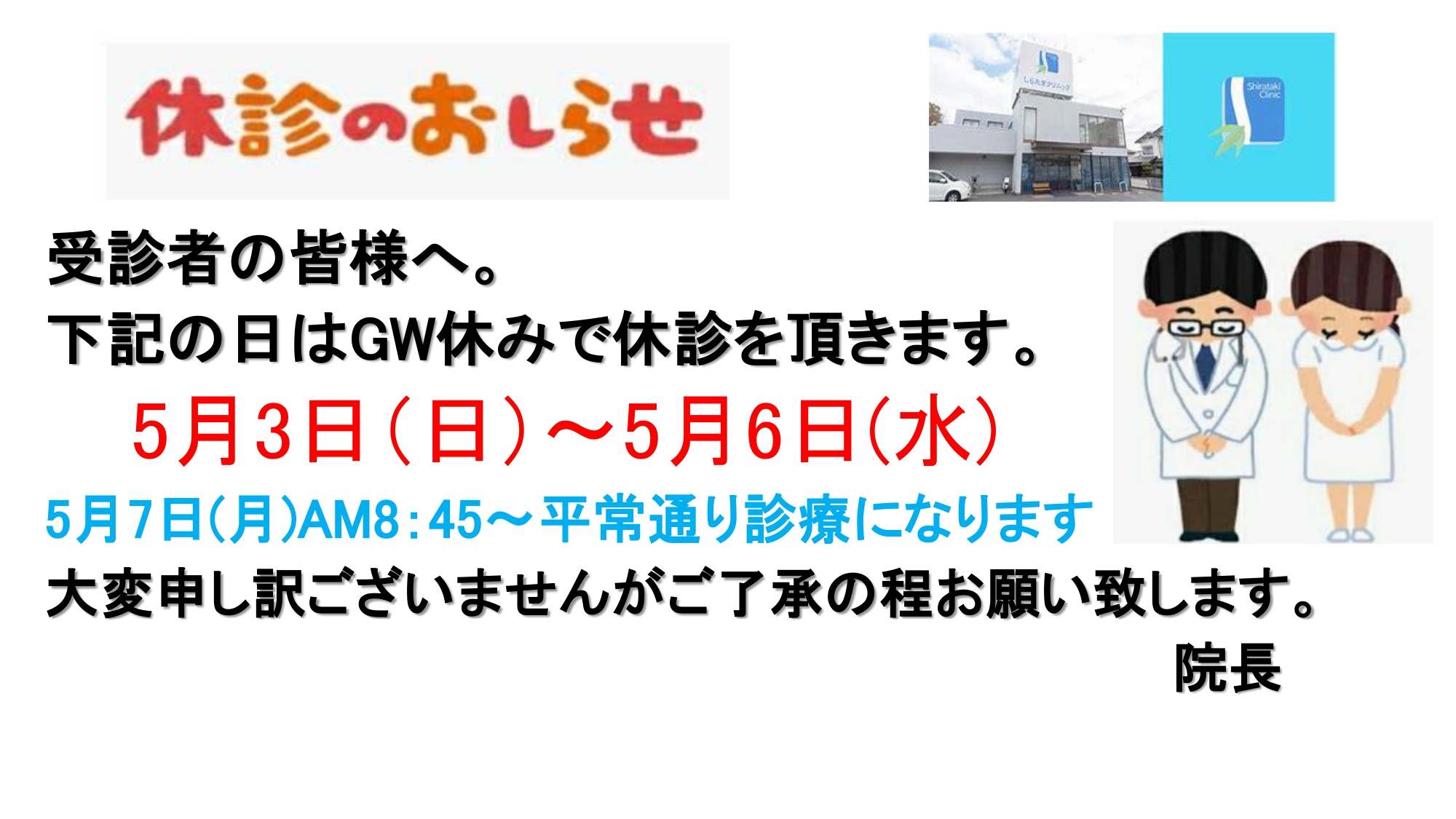 本年5月3日(日)~5月6日(水)休診を頂きます。